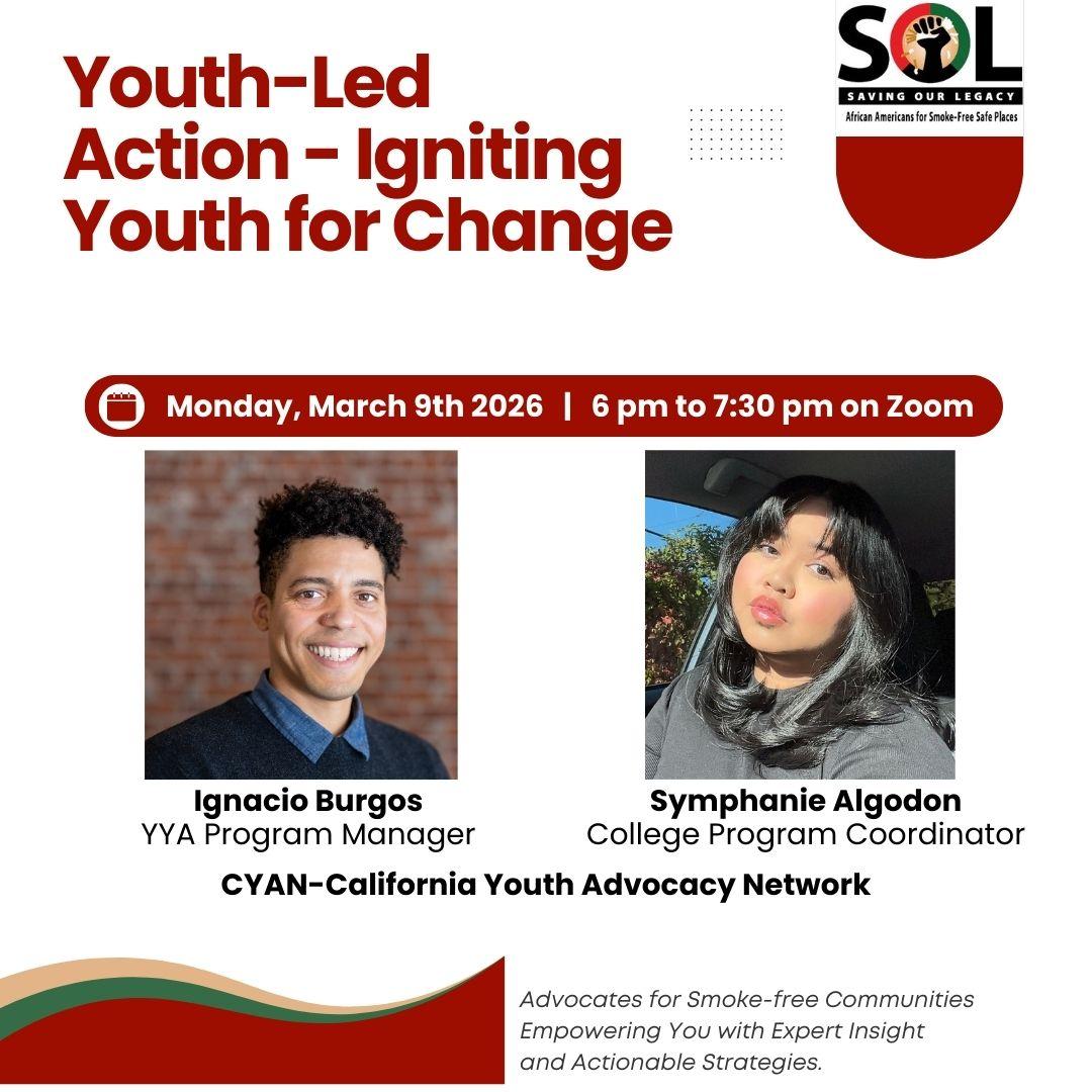 | | SAVE THE DATES! March 4-5, 2026 in Sacramento - CLICK HERE to get more info about the agenda for California Healthy Housing Coalition. | | Join The SOL Project for Youth-Led Action: Igniting Youth for Change, a virtual training workshop on Monday, March 9, from 6:00–7:30 PM via Zoom. Designed for faith leaders, community and housing advocates, and community-based organizations, this session features guest experts Ignacio Burgos and Symphanie Algodon from the California Youth Advocacy Network (CYAN). Learn proven strategies for recruiting and engaging youth, effective youth-led advocacy models, and insights on vaping and smoking challenges youth face today. | | |