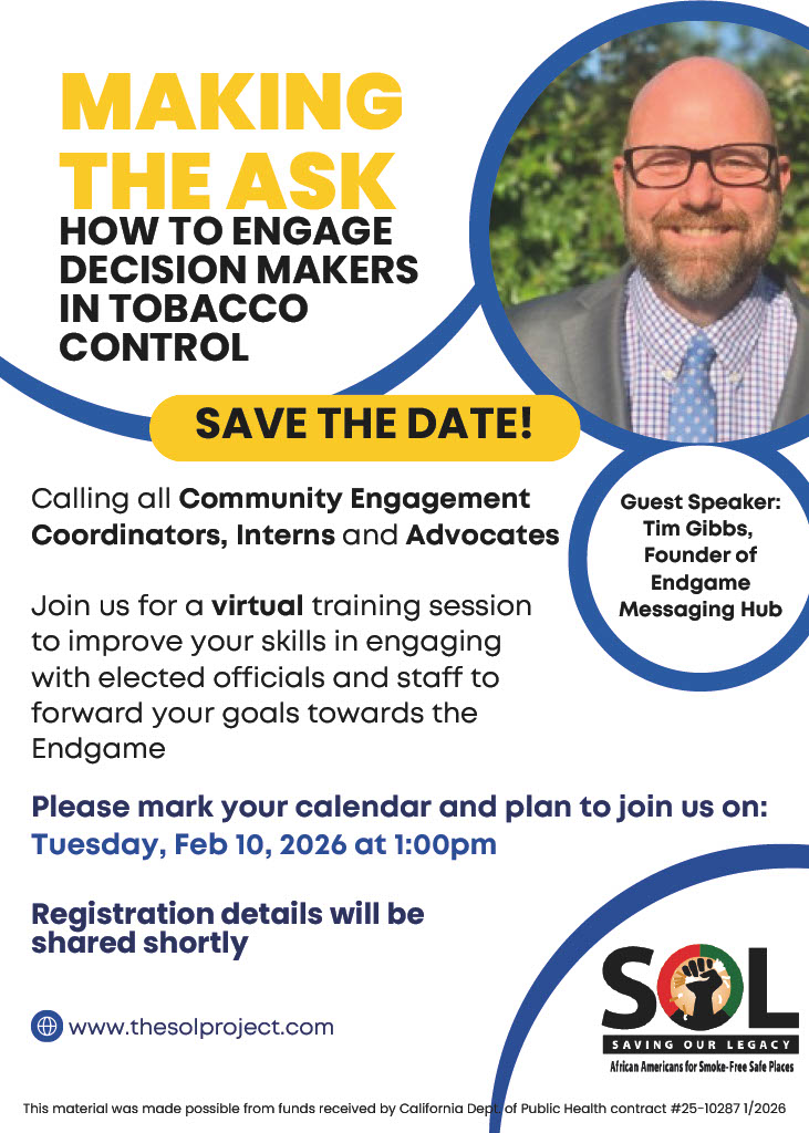 Save the Date! The SOL Project is hosting a virtual training featuring guest speaker Tim Gibbs, designed to strengthen skills in engaging elected officials and advancing tobacco control policy. This event is ideal for community engagement staff, interns, and any interested in becoming tobacco control advocates! Stay tuned for registration details coming soon.