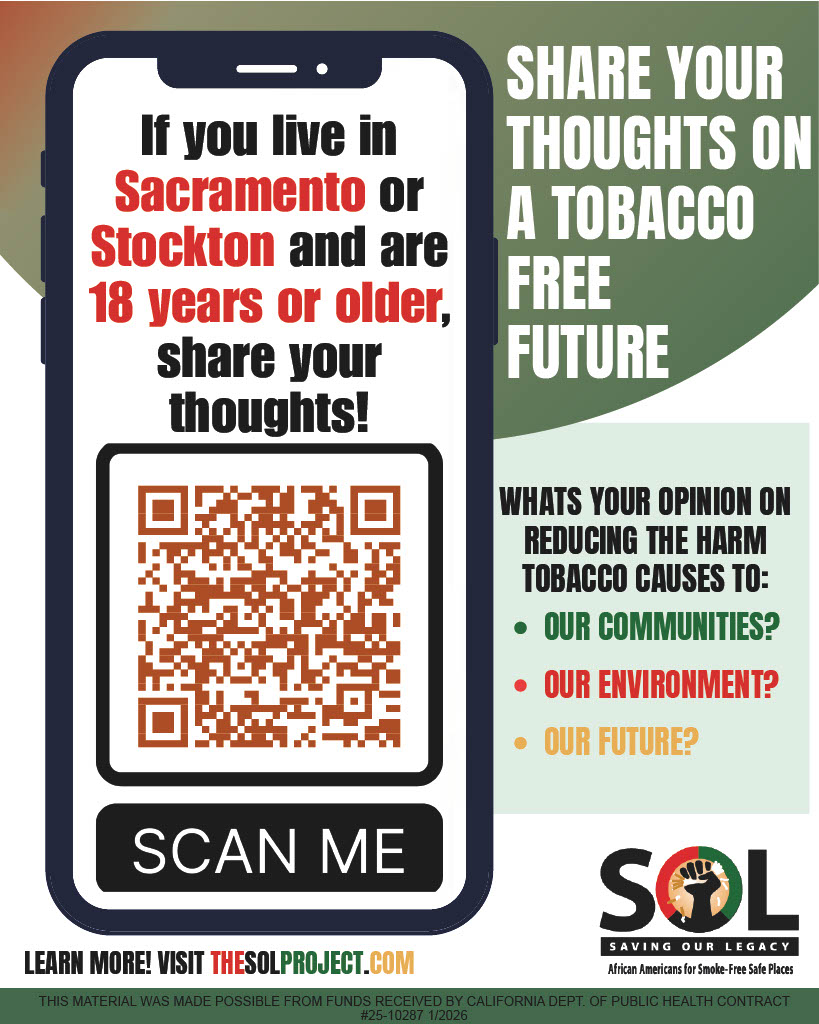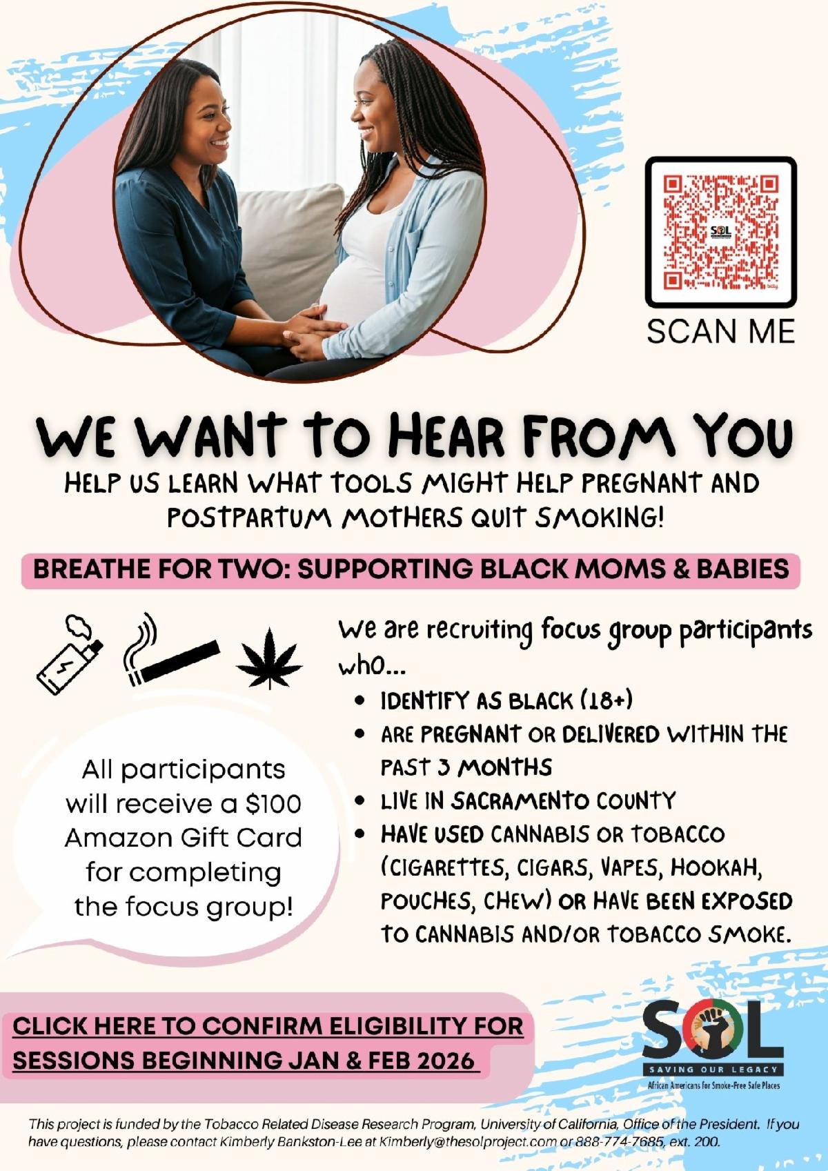 Help shape tools to support smoke-free pregnancies. We’re seeking Black pregnant or recently postpartum moms in Sacramento County to share their experiences with tobacco or cannabis exposure. Participants receive a $100 Amazon gift card.