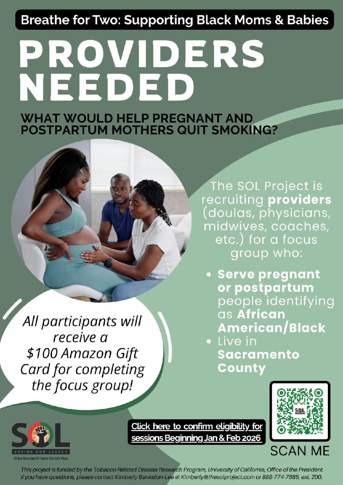 The SOL Project is recruiting doulas, midwives, physicians, coaches, and maternal health providers in Sacramento County to join focus groups supporting Black moms and babies. Participants receive a $100 Amazon Gift Card.