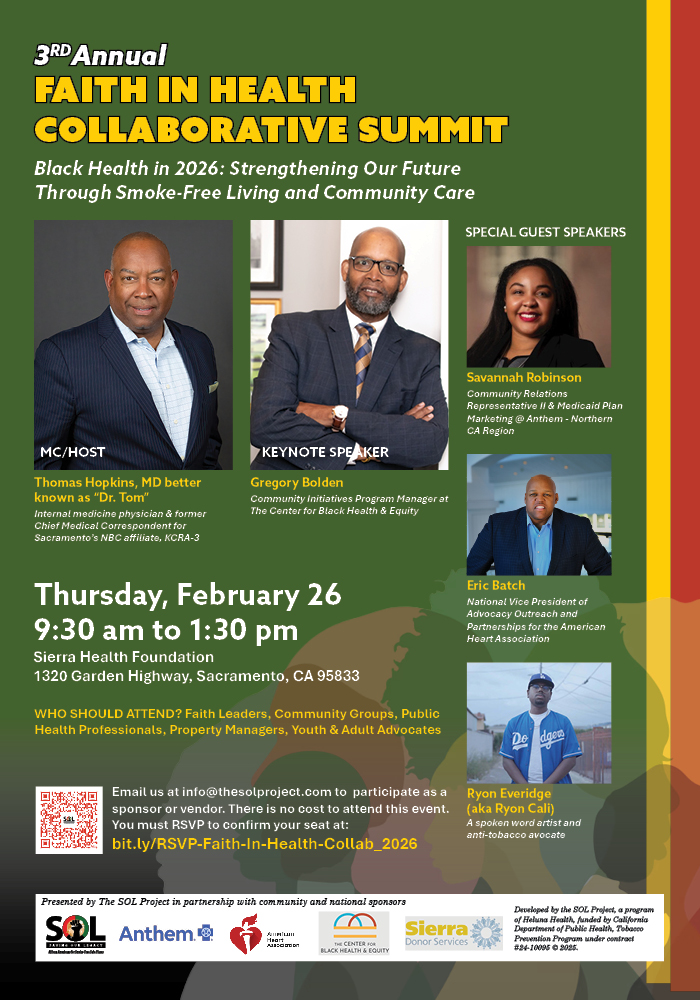 The SOL Project proudly presents the 3rd Annual Faith In Health Collaborative Summit on Thursday, February 26, 2026, from 9:30 a.m. to 1:30 p.m. at the Sierra Health Foundation in Sacramento.