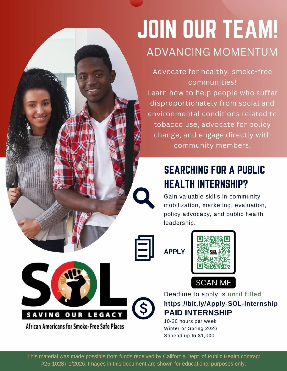 | | | The SOL Project is looking for applicants for our public health pipeline internship! This paid, hybrid internship is Sacramento-based, serving as a way for college students to explore opportunities in public health with a focus on tobacco control leadership, local policy advocacy, and health equity. We would appreciate if you could share our flyer within your networks and to interested candidates. Thank you! | | |