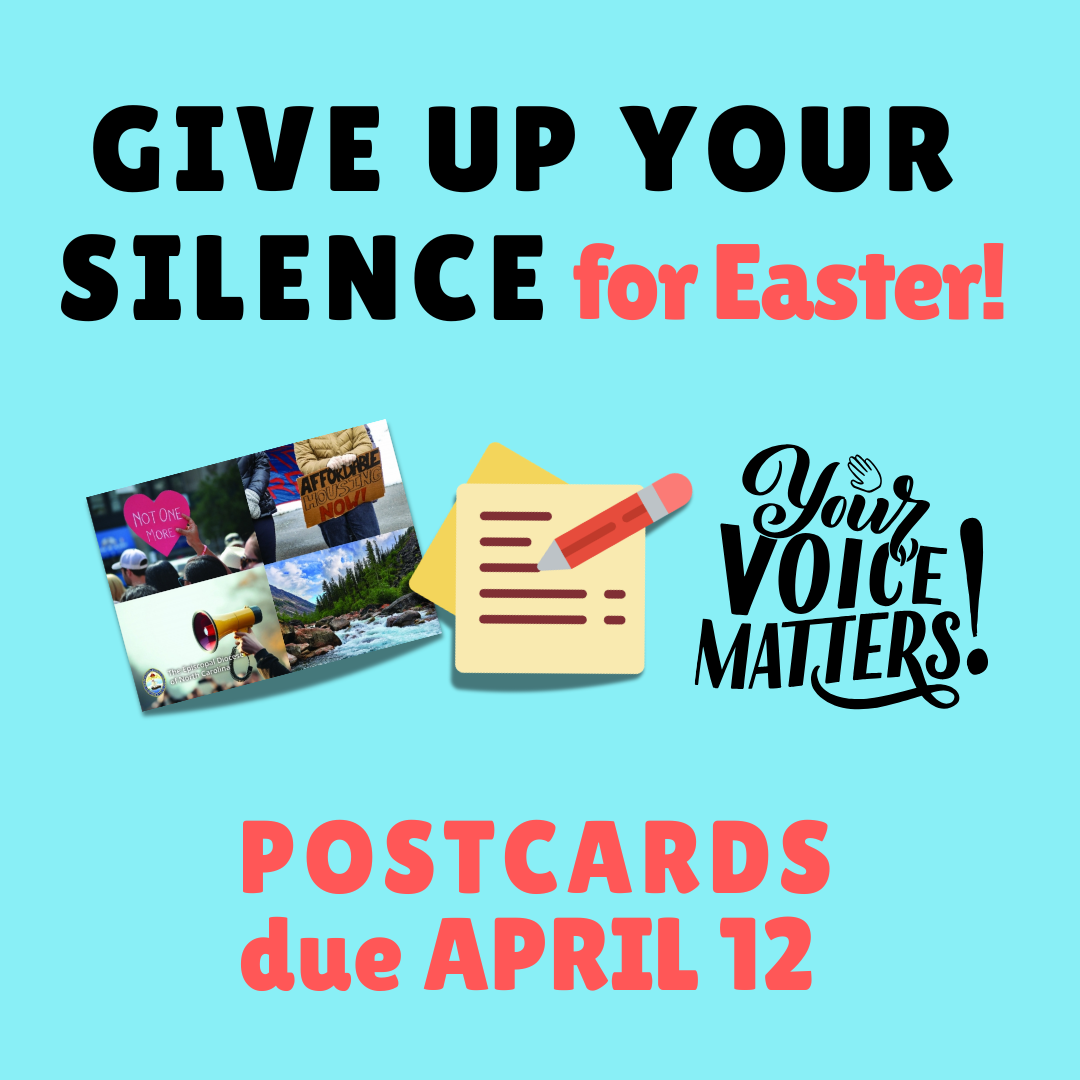 We are called to join Episcopalians across the Diocese in a Give Up Your Silence postcard campaign. Please stop by the Advocacy Table in the Parish Hall after worship on April 12 to write or drop off your completed postcard to state legislators for diocesan Advocacy Day 2026. The table will have updated materials about legislation on current advocacy topics as well as all supplies and information.