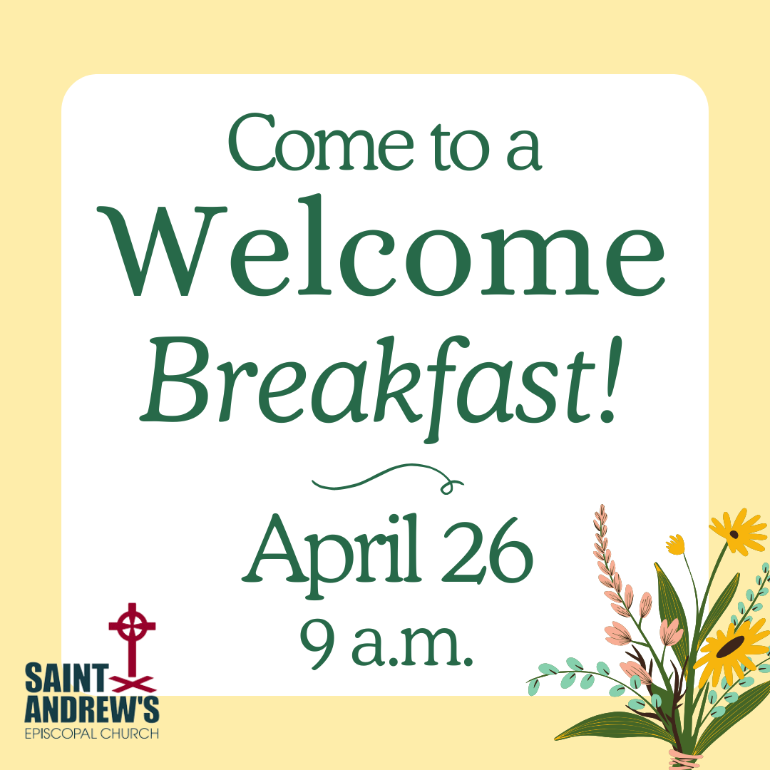 Want to learn more about St. Andrew’s and how you can connect with our mission? You are invited to a Welcome Breakfast on Sunday, April 26, 9:00–9:45 a.m., in the Parish Hall. This is an opportunity both for new members and for those who are newcomers who have not yet joined St. Andrew’s to meet fellow parishioners and ministry leaders and learn more about St. Andrew’s mission and outreach. We will answer questions and provide information about the groups and ministries that make St. Andrew’s a vibrant community of faith. Breakfast will be served. RSVP to Rev. Eric Tuttle at the link below.