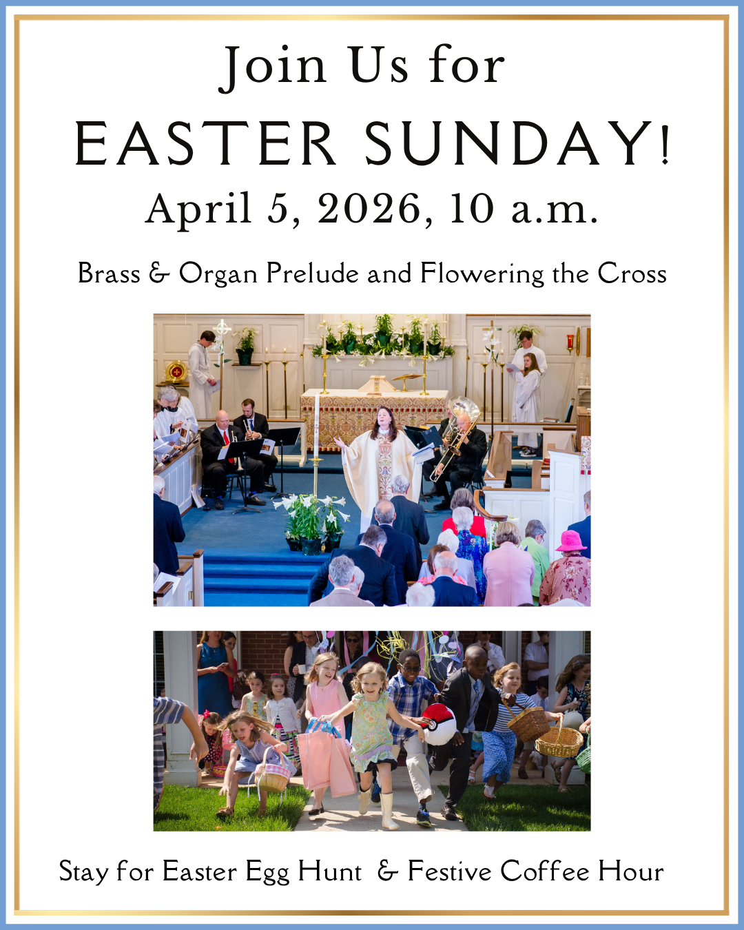 On Easter Sunday we will welcome all to celebrate the risen Christ with joy. A brass and organ prelude will be offered in the 10 minutes before worship. You are invited to bring flowers to add to the cross outside and bells to ring at each "Alleluia!" Nursery care will be provided. Our school-age children will stay in church for this special day of worship. We will have Easter busy bags full of stickers, bells to ring, and other activities available at the church entrance. After worship, children are invited to an Easter Egg Hunt—rain or shine!—and we will have a Festive Cake & Coffee Hour in the Parish Hall for all.