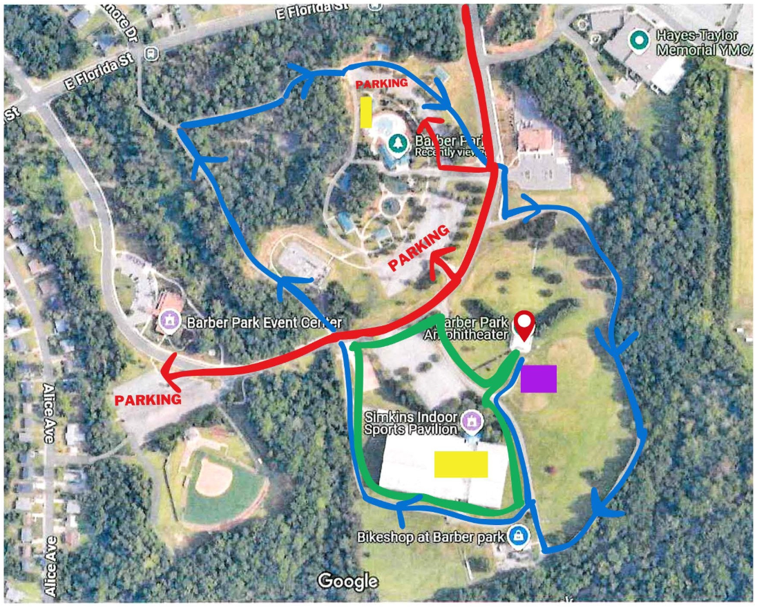 LOCATION: Enter Barber Park at 1500 Barber Park Drive and follow the signs. See map and key below for park layout, including parking lots, starting point (amphitheater), and walk route (blue path).