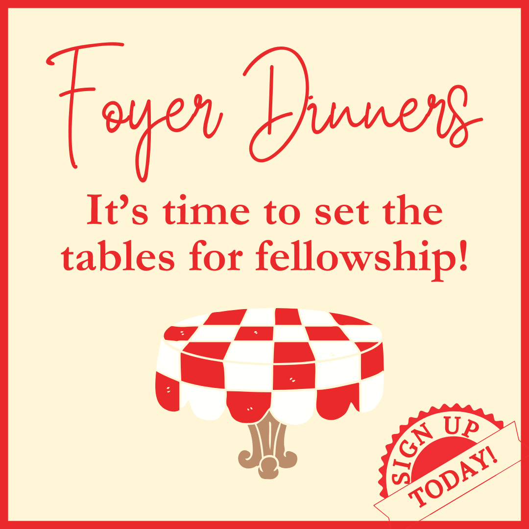 We are now taking signups for our next round of foyer dinner groups! Foyer Dinners are a wonderful way to get to know fellow parishioners. Groups of 6–8 members meet monthly in members’ homes or restaurants to share a meal and get to know each other outside of our parish life. Please sign up online at the link below or on the signup sheet in the Parish Hall. To learn more, talk to Ralph and Laura Bricker after worship, or contact them at 843-263-3288 or by email using the link below.