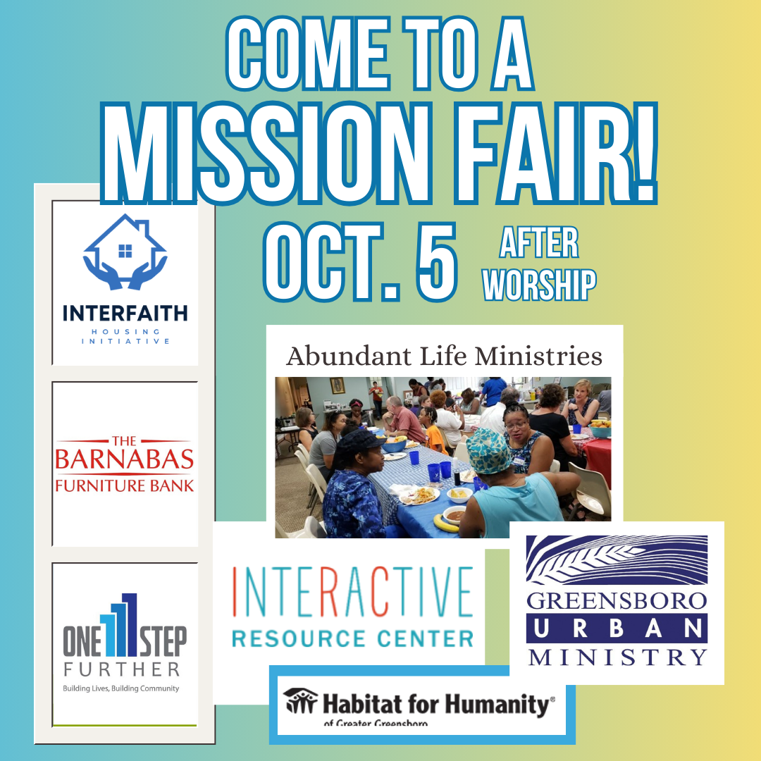 The Mission & Outreach Committee is pleased to sponsor a festive Mission Fair on Sunday, October 5, immediately after worship. This will be a wonderful opportunity to join in community and conversation with our partner agencies working hard to address the increasing needs to feed the hungry and shelter the houseless. Join us in the Parish Hall, where we will host representatives from Greensboro Urban Ministry (G.U.M.), The Barnabas Network, the Interactive Resource Center (IRC), One Step Further Food Pantry, Habitat for Humanity, Abundant Life Ministries, and the Interfaith Housing Initiative (IHI).