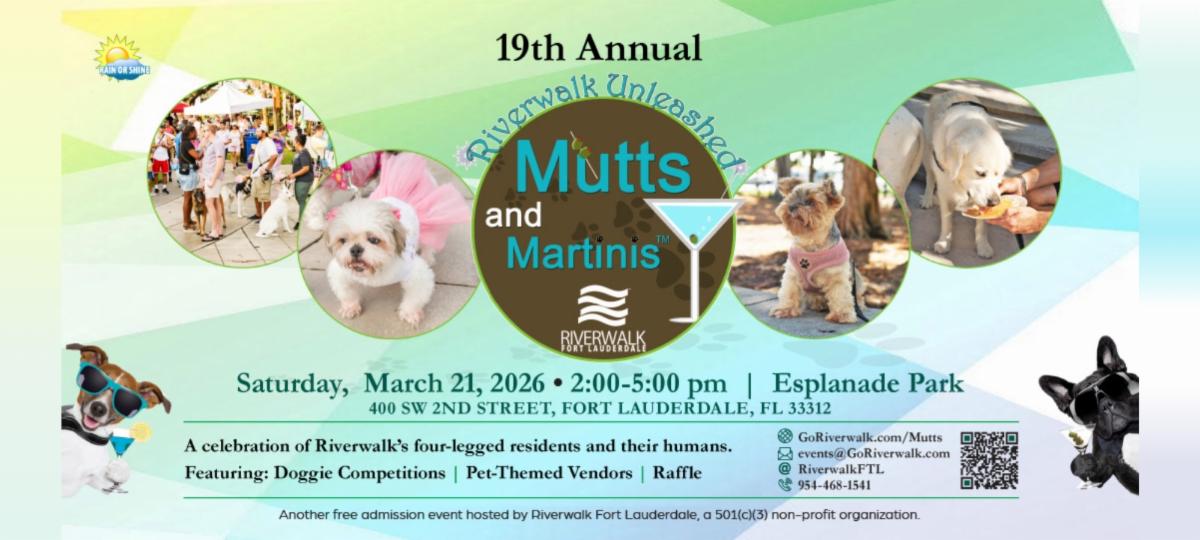 Join APR at Riverwalk Mutts & Martinis, Fort Lauderdale's largest outdoor pet-friendly cocktail party! A fun free afternoon celebrating dogs and their humans along the Riverwalk. Enjoy dog-friendly activities, pet-themed vendors, a silent auction, and the chance to meet adoptable pups from local rescues.
