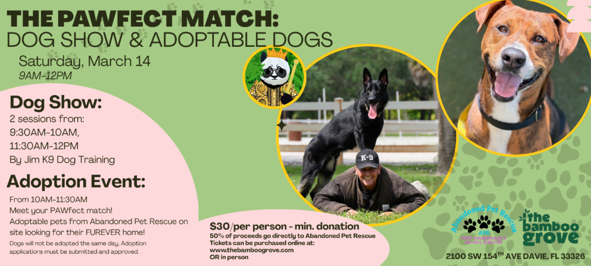 Join APR at The Pawfect Match, a special morning event featuring a live dog show and the chance to meet adoptable dogs from Abandoned Pet Rescue. Enjoy expert demonstrations by Jim K9 Dog Training while connecting with pups looking for their forever homes, with proceeds supporting APR’s lifesaving work.