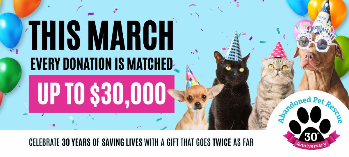 This March, Abandoned Pet Rescue is celebrating 30 years of providing second chances to cats and dogs in our community. To honor this milestone, every gift will be matched dollar for dollar up to $30,000 throughout the month.