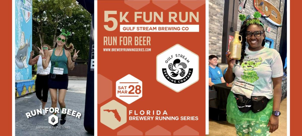 Join us at Gulf Stream Brewing on March 28 for a 5k-ish, fun run event that starts and ends at this awesome taproom in Ft Lauderdale. Run, walk, jog - whatever goes! Complete the course and celebrate with us and a FREE, local craft brew at the finish line.