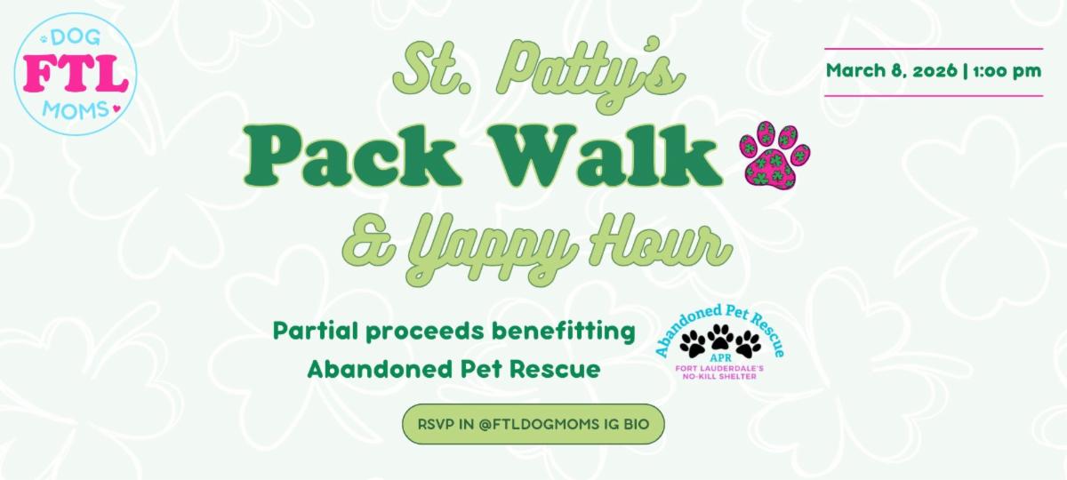 Join FTL Dog Moms for a festive St. Patrick’s Day–themed Pack Walk and Yappy Hour in Fort Lauderdale, bringing together local dog moms, dog dads, and pet lovers for an afternoon of community and fun. The event includes a group walk followed by a social hour with vendors, food, drinks, and activities, with a portion of proceeds benefiting Abandoned Pet Rescue.
