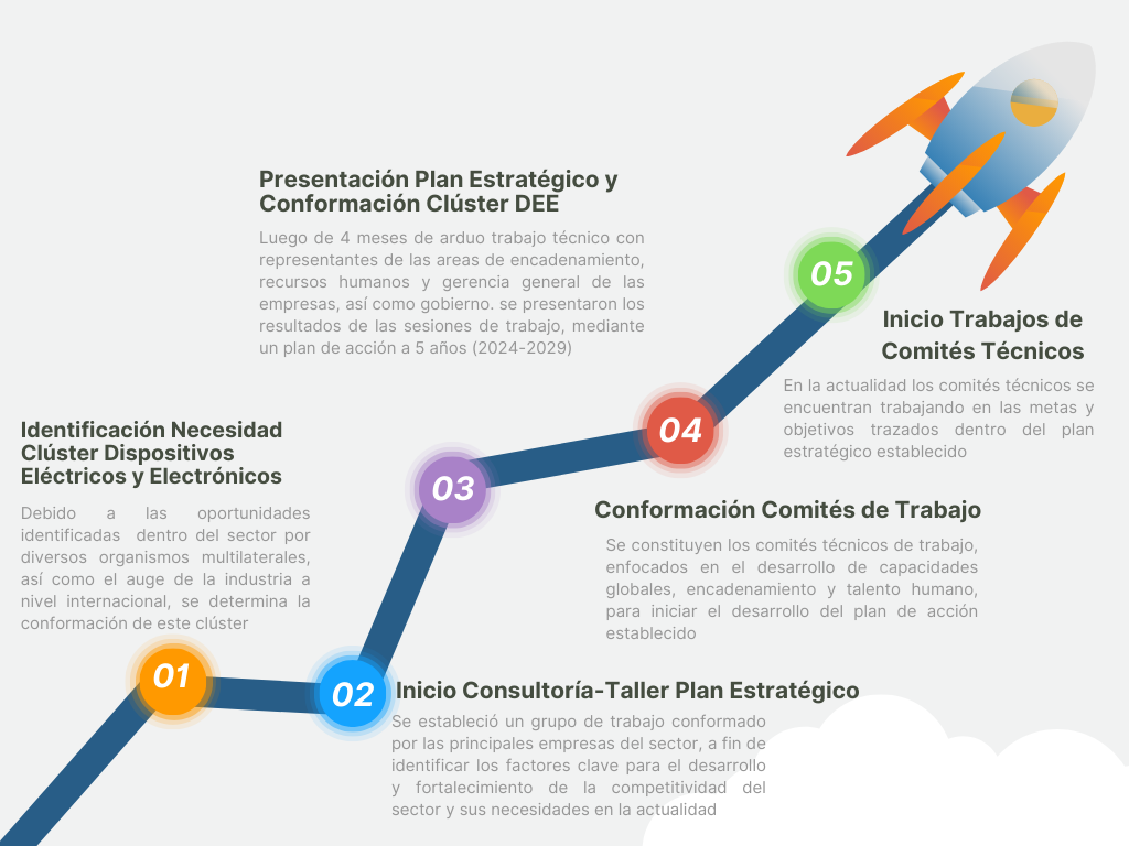 El 14 de julio de 2023, en el marco de la creación del Clúster de Dispositivos Eléctricos y Electrónicos, las empresas miembro del Clúster, así como los representantes de operadoras de parques de zonas francas, se dieron cita al primer encuentro formal de esta agrupación, con la finalidad de conocer la dinámica general de los Clústeres de ADOZONA, así como los próximos pasos para determinar la agenda a ser agotada por el clúster y la elaboración de su plan estratégico para los próximos 5 años. |