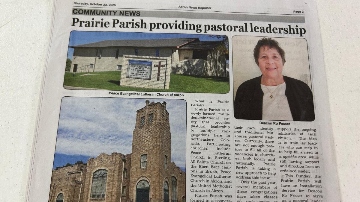 | | Prairie Parish is a newly formed multi-denominational entity that provides pastoral leadership to multiple congregations in northeastern Colorado, and includes: Peace Lutheran Church in Sterling, All Saints Church on the Eben Ezer campus in Brush, Peace Evangelical Lutheran in Akron, and the United Methodist Church in Akron. | |