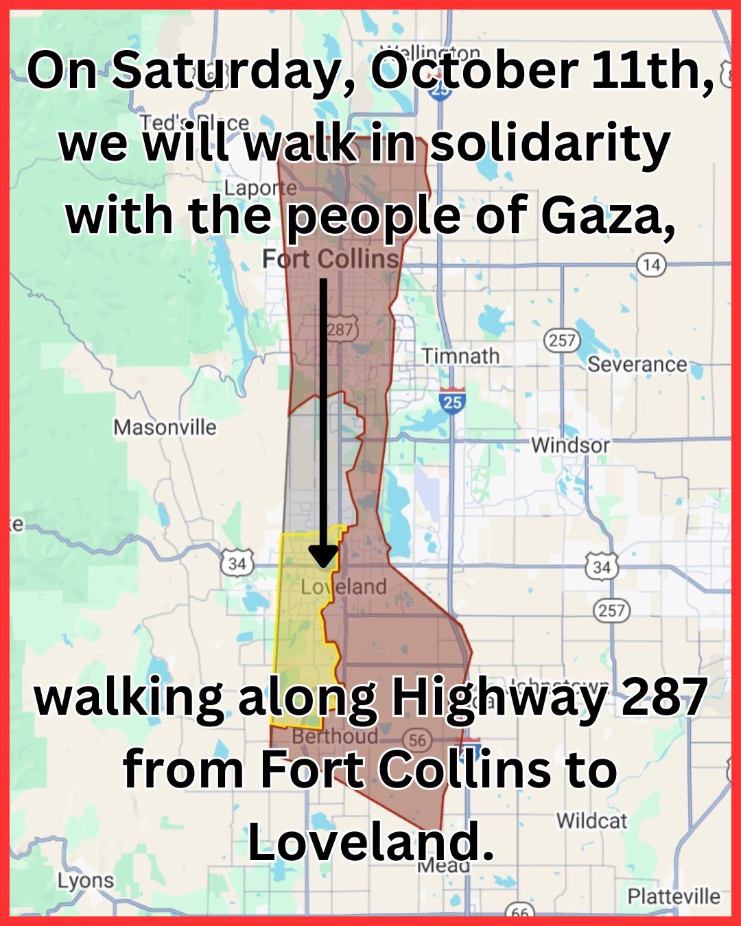 October marks two years of genocide in Gaza. Genocide funded with our taxes. Genocide supplied by our very community. Join us to raise awareness of the continuing horrors of two years of genocide, and to stand in solidarity with the people of Gaza, walking along Highway 287 from Fort Collins to Loveland. Bus access should be available along the entire route.