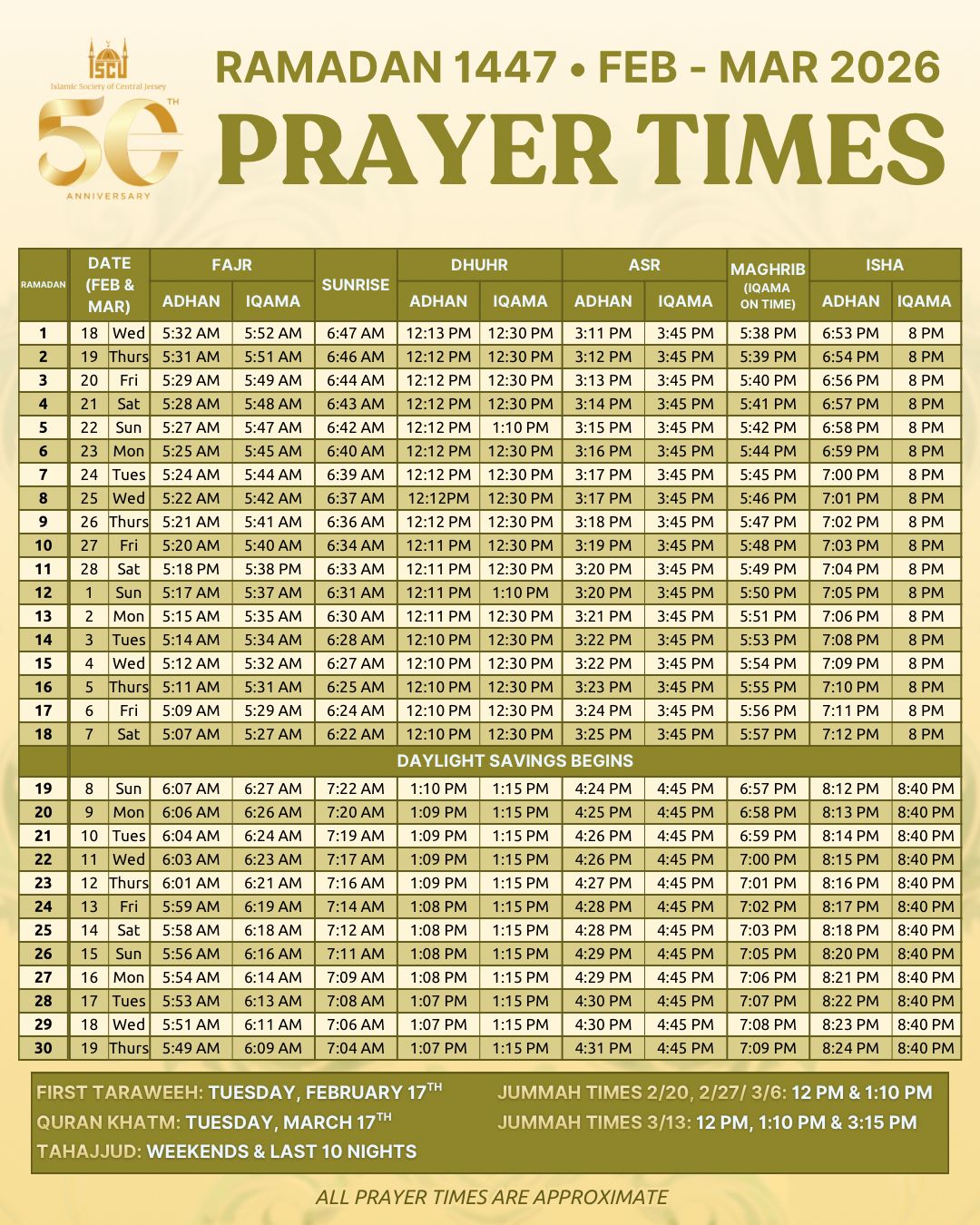 Taraweeh Begins Tue Feb 17, 8pm Isha Iqama