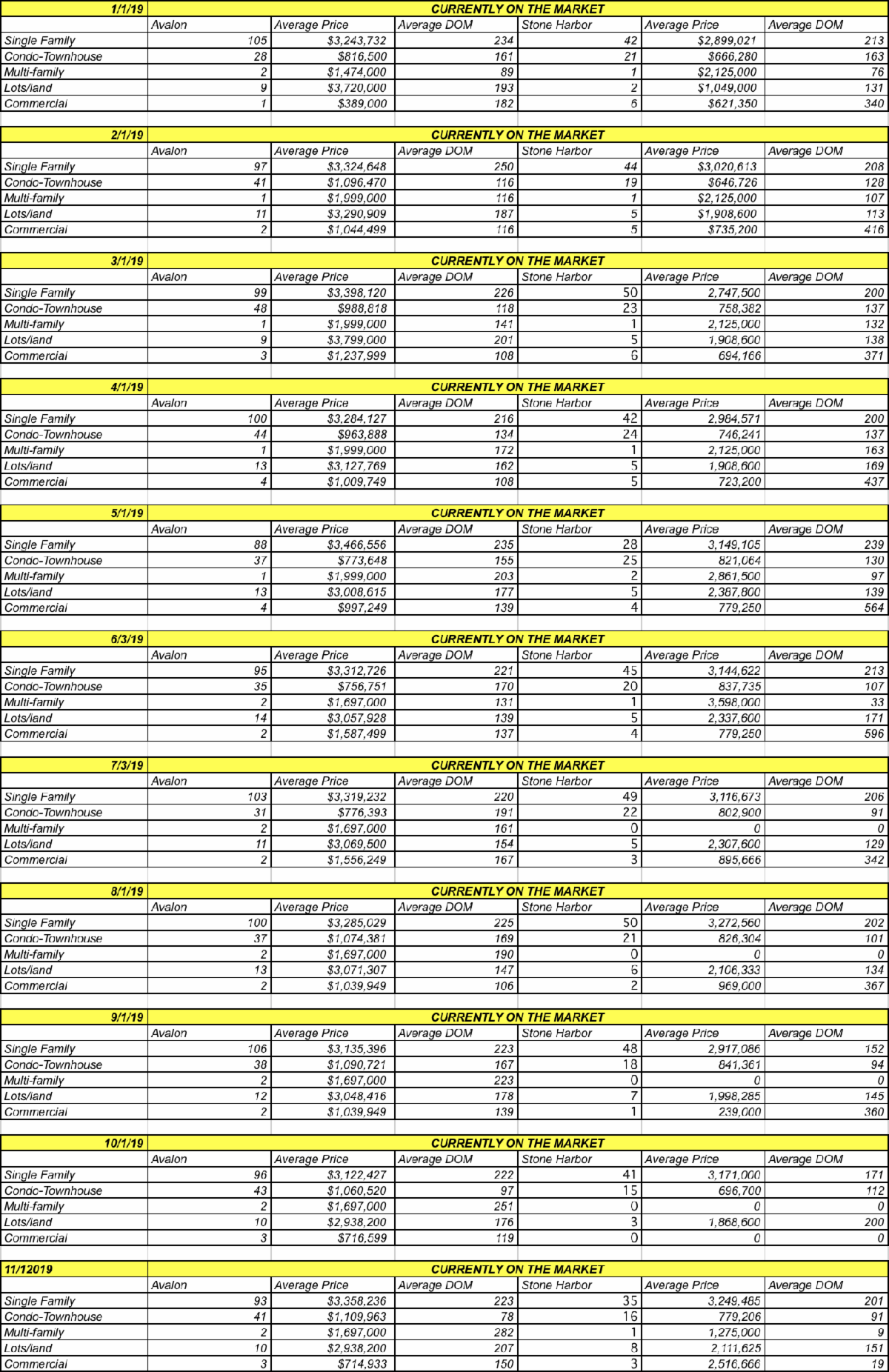 All the beach block sales (3) in Avalon were tear downs - $1.6-$2,224,000 making way for new construction properties for 2020. Values continue to grow as we sell through property at a faster pace. Average price for the month increased by 15% while average days on market continue to decrease to right around three months. The island has under a six month supply of townhome/condos for sale and 30% of the condos are of the
