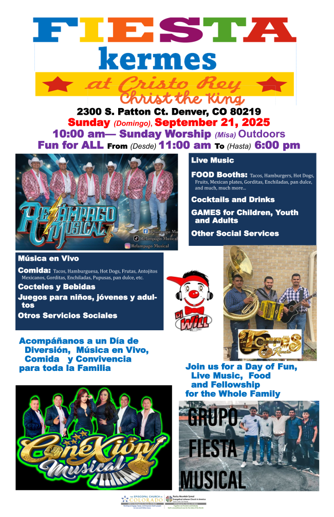 | | | Upcoming Synod Happenings | | September 21, 11:00am–6:00pm | | Mark your calendar for Saturday, September 21, as Christo Rey / Christ the King hosts our Fiesta Kermes — an afternoon & evening of food, fun, music, and community joy! Bring family & friends for tacos, treats, games for kids, live music, and plenty of laughter. Don’t miss this chance to celebrate together and support our parish. | For more information, contact Rev. Quirino Cornejo (qcornejo@rmselca.org) | |