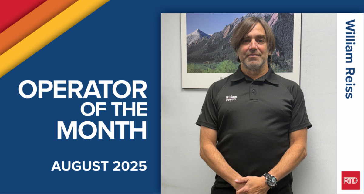 Operator of the Month — August 2025: William Reiss | August's Operator of the Month is Boulder Division's William Reiss. Reiss was selected for his courtesy, professionalism and punctuality. As an operator for the Route AB2, he is responsible for getting his customers to and from the airport on time, something he does very well. His customers commend him for his willingness to listen to their questions and concerns and provide helpful solutions to make sure their needs are met. |