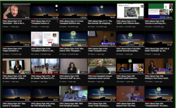 | | TRIO Transplantation Library | | TRIO's Transplant Presentation Library is one of TRIO's most important programs of information and assistance to transplant patients and their families. There are almost 200 programs now available that address almost any imaginable topic of interest to the transplant community. Whether you're looking for food advice, how to deal with stress, the latest science regarding transplantation, or just for a great movie, the Transplant Presentation LIbrary will meet your interests. Click on the button below for the full library index: | | | | |