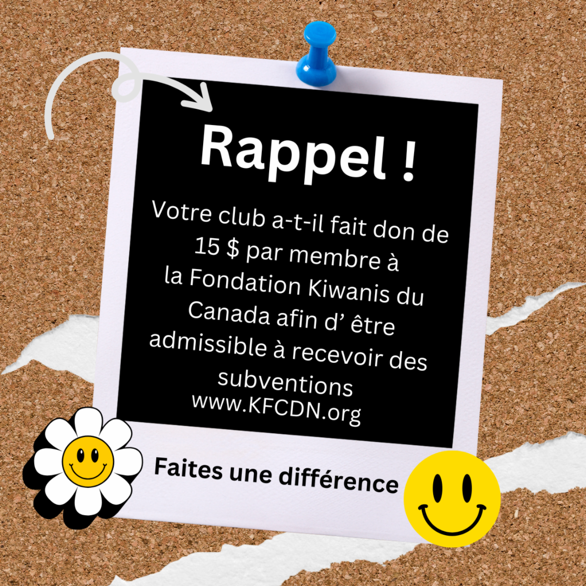 · Un don de 375 $ par le club (25 membres x 15 $) à la Fondation Kiwanis du Canada rend le club admissible à recevoir des subventions.