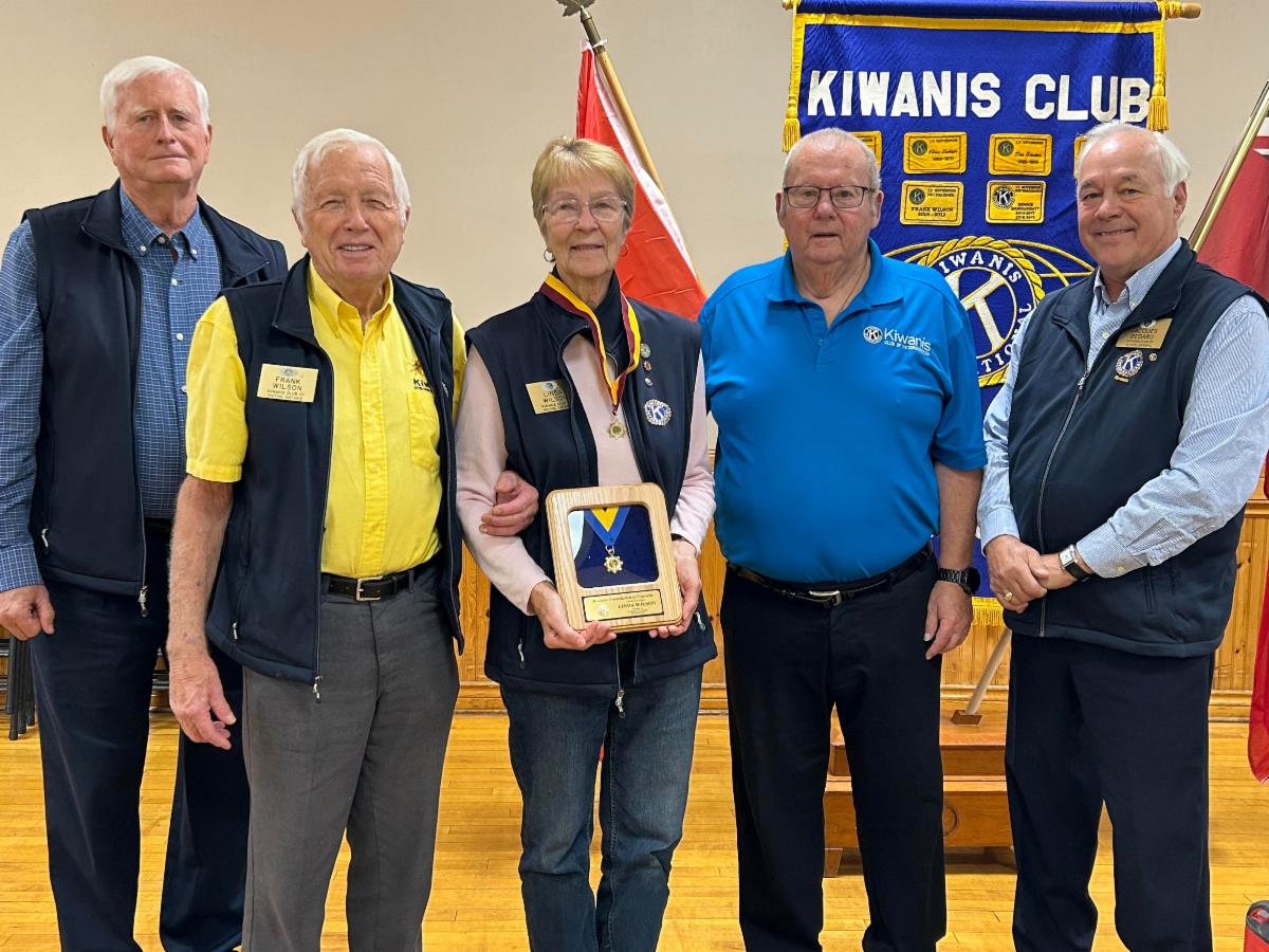 The Mel Osbourne Diamond award was presented to Picton Kiwanian Linda Wilson by our Lieutenant Governor Dave Post. The Wilsons, Frank and Linda were recognized for Taking a leading role in many of the Picton Kiwanis projects. Kiwanian Linda initiated projects and has continually been doing outstanding preparatory planning and work for the annual Canada Day, County Pancake breakfast. Pictured are Kiwanian Wynand Van Soelen, Past Distinguished Lieutenant Governor, Frank Wilson, The Mel Osbourne Diamond award recipient Linda Wilson, Lieutenant Governor Dave Post and Picton Kiwanis president Jacques Bedard.
