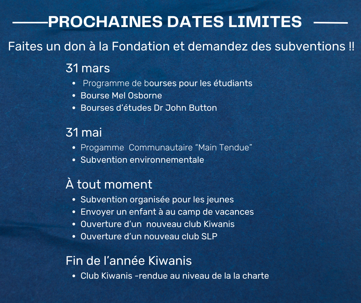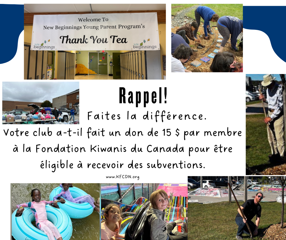 À titre de rappel amical, vous pouvez soutenir la Kiwanis Foundation of Canada et avoir un impact significatif dans nos communautés en faisant un don en ligne via notre lien Canada Helps. Faire un don par l’intermédiaire de Canada Helps est non seulement pratique, mais aussi un excellent moyen de vous assurer de respecter la date limite de fin d’année de l’ARC pour les contributions caritatives. Chaque don donne droit à un reçu officiel aux fins d’impôt, ce qui facilite plus que jamais le soutien à notre mission et la reconnaissance de votre générosité. Merci pour votre soutien continu !