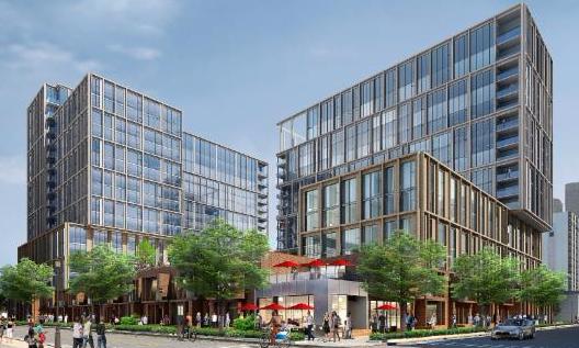 The John Buck Co.'s plan for 586 residential units in the West Loop includes a pair of 17-story buildings and low-rise townhomes. The $200 million project calls for a Neighborhood Opportunity Bonus system payment of $2.31 million and 59 affordable units on site.