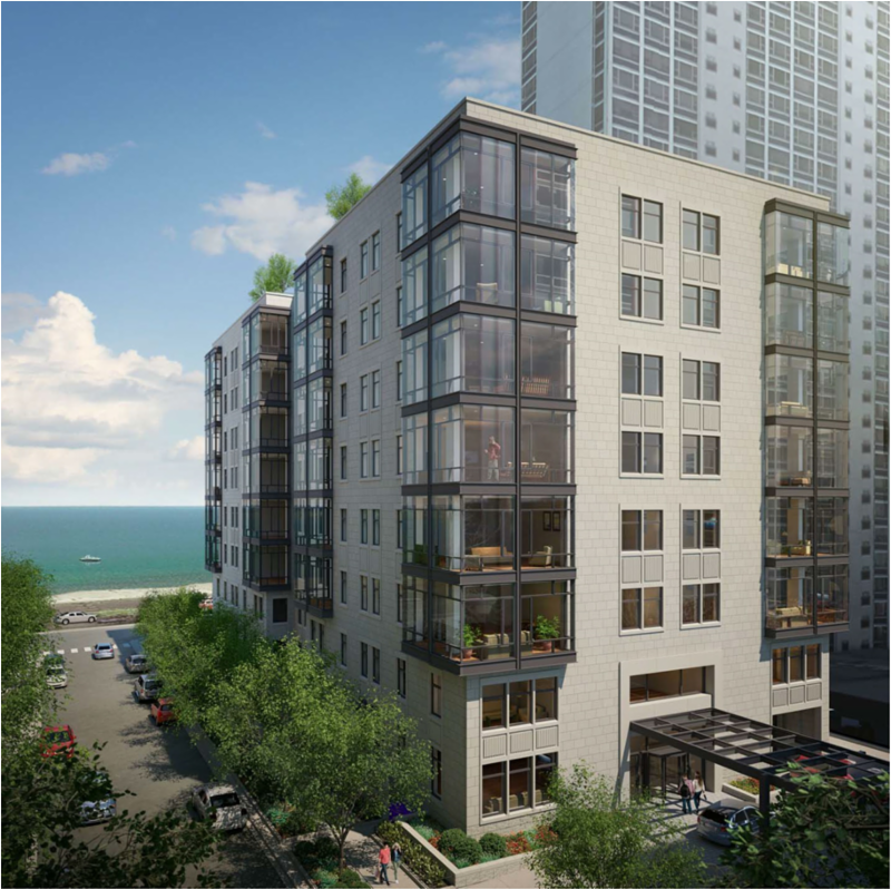 Draper & Kramer's plan to replace the Gold Coast's only lakefront parking lot includes 58 two- and three-bedroom units in an eight-story building. Forty-two parking
