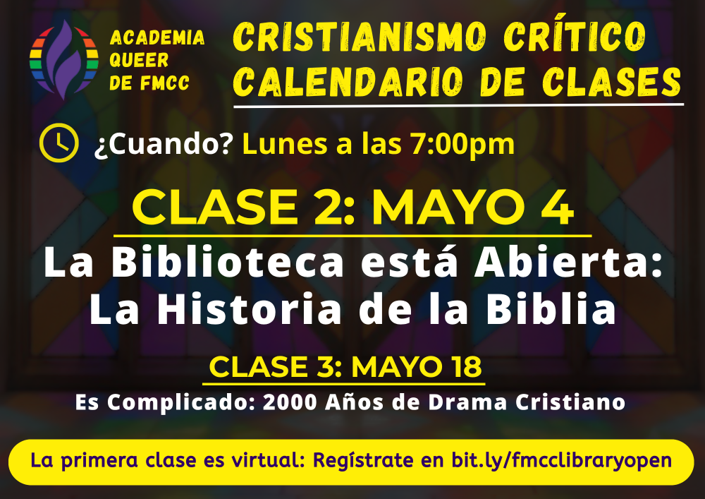 | | Nuestro podcast de los fundadores de MCC, titulado «Queer Christian Faith», está disponible en Spotify, Canal de Iheart, Apple, audible (amazon) y en nuestro canal de YouTube: MCCLATV (mcclatv - YouTube). | | |