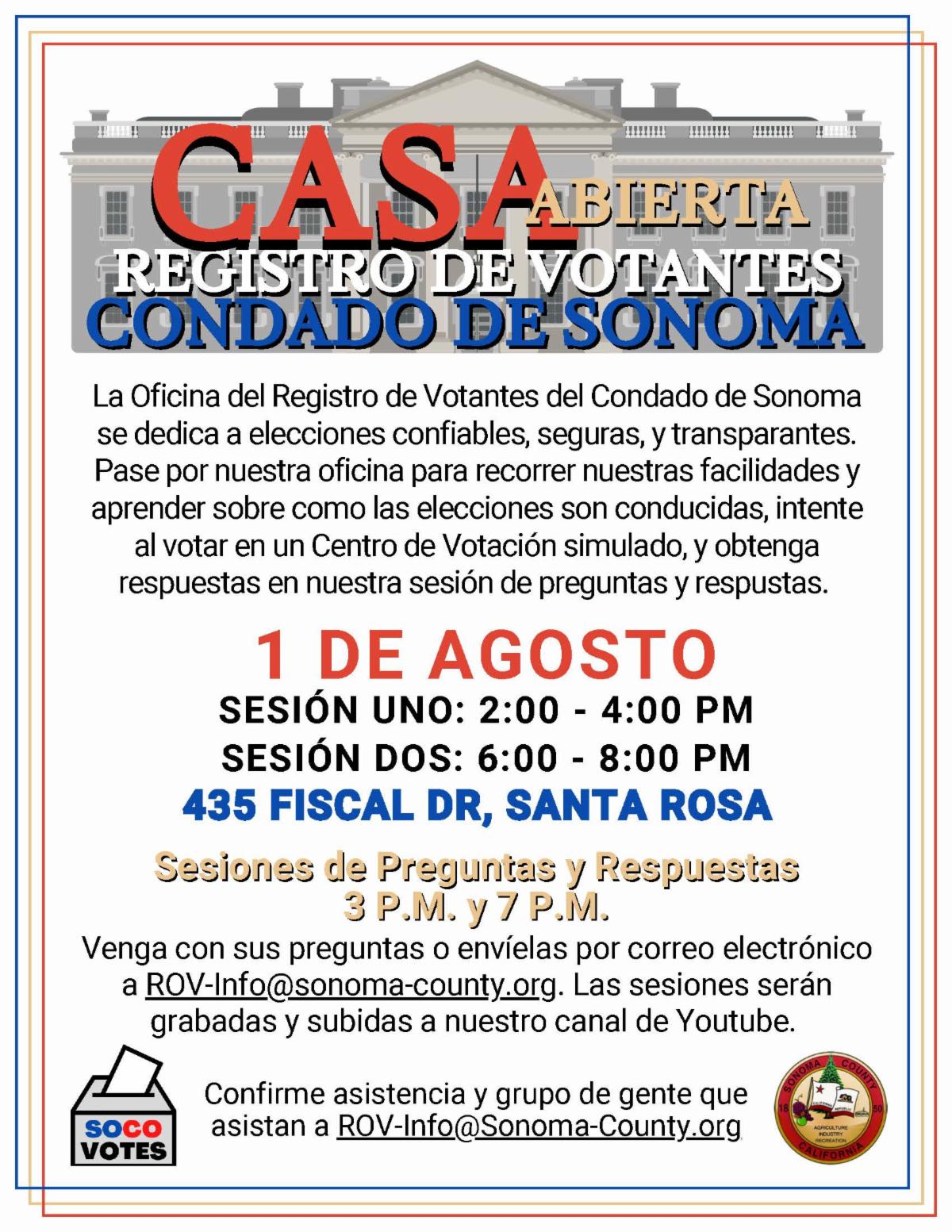La Oficina del Registro de Votantes del Condado de Sonoma organizará una jornada de puertas abiertas el 1 de agosto. El evento contará con dos sesiones, cada una de las cuales incluirá una "mini sesión" de preguntas y respuestas para interactuar con la comunidad y abordar cualquier pregunta.