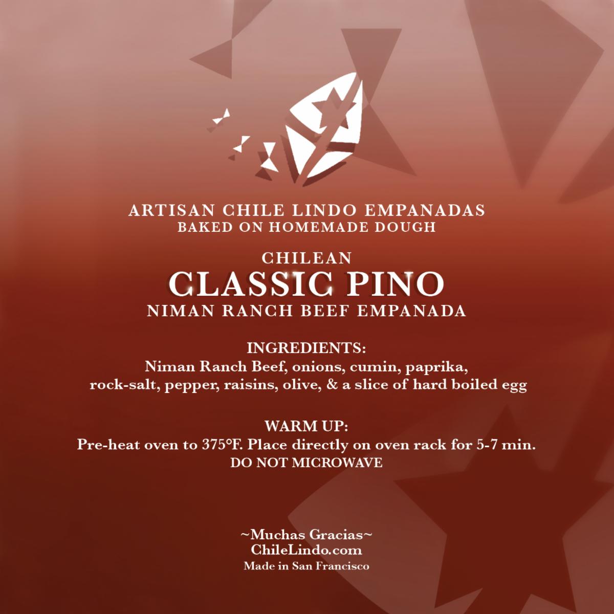 Chile Lindo is famous for the authentic Chilean beef empanada, or as it is known in Chile, la empanada de pino. The term pino stands for a stuffing prepared with minced meat, sautéed onion, raisins, a slice of hard boiled egg and a black olive. | |