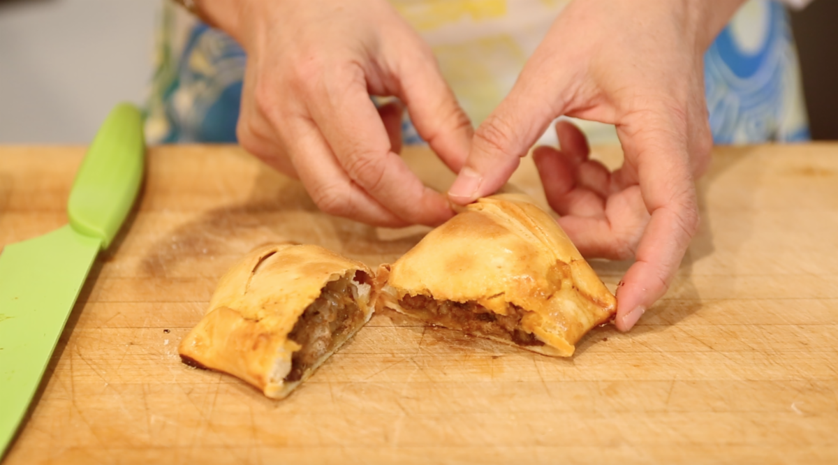 plant based beef, onions, cumin, paprika, rock-salt, pepper, raisins & a black olive. Chilean classic pino recipe for vegans
