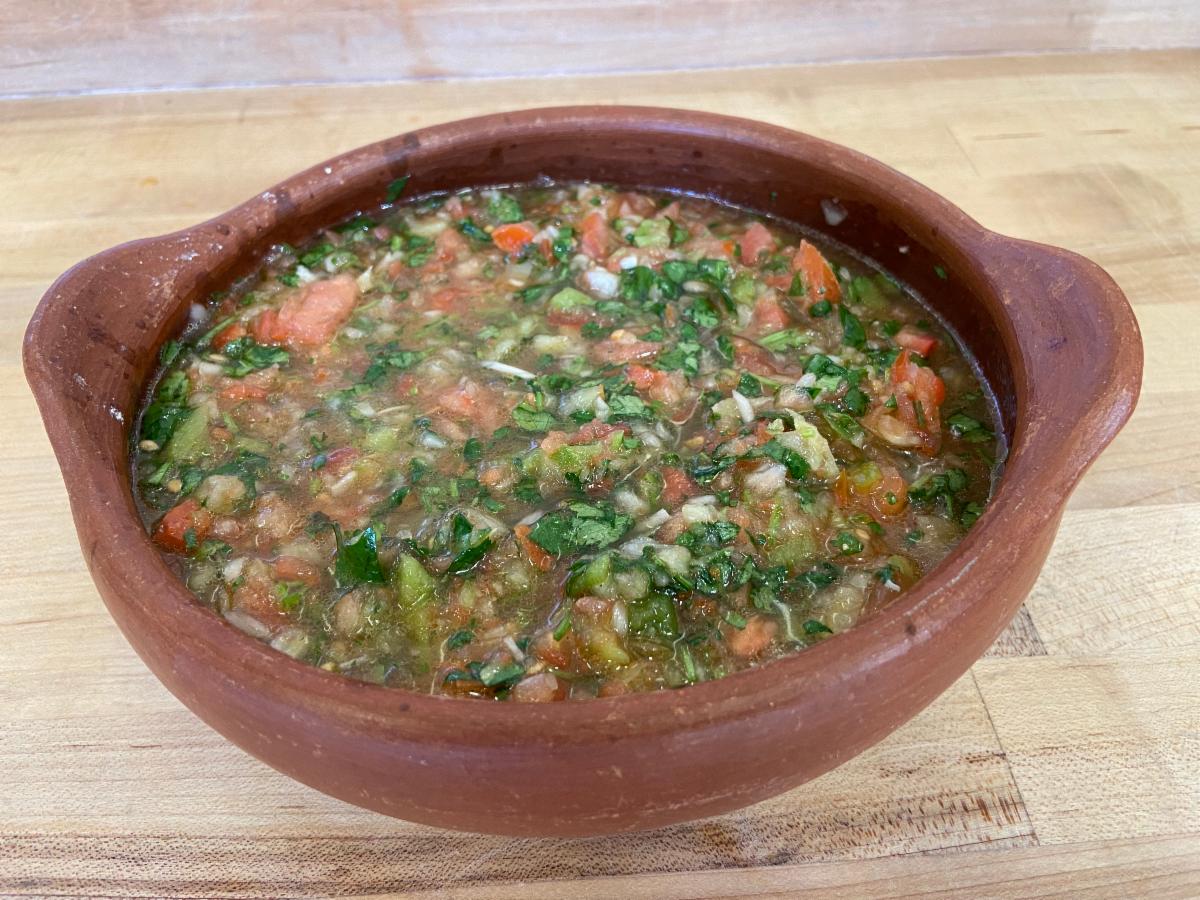 A Chilean traditional salsa made with ajĂ amarillo (yellow chili pepper), onions, tomatoes, bell peppers, garlic, cilantro, salt, pepper, lemon juice & olive oil.