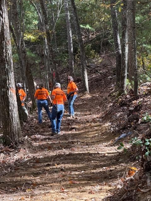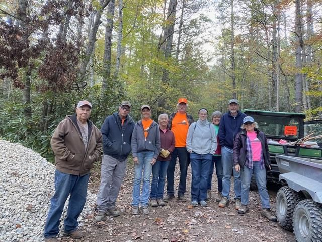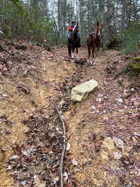 The Back Country Horsemen of the Virginia Highlands just finished an important reroute project on the Virginia Highlands Horse Trail (VHHT) in the Mount Rogers National Recreation Area in Southwest Virginia that was a long time in coming! First proposed in 2007, when the BCHVH was originally formed, the project’s goal was to reroute the trail around a serious washout on a 350’ section of fall line trail. Over the years the project got dialed back to zero many times due to lack of funding, lack of FS personnel, FS turnover etc. With a new and proactive Forest Service team in place the BCHVH once again proposed the project, this time with a plan, equipment, manpower and funding from numerous donations and fundraisers. The project was approved and was formatted as a collaboration between the BCHVH, AK Trails LLC and the Forest Service. BCHVH planned, funded and implemented the project with the help of the Forest Service who used their dozer to rough in the initial corridor. BCHVH hired AK Trails LLC to create the trail tread with an excavator while BCHVH members did all the finish work, readying the trail for use. After the many years of trying to get this project going the actual work took only 6 days! The steep and dangerous washout was replaced by 0.6 mi of new, beautiful and sustainable trail! This project was a great example of many entities working together for a common goal!
