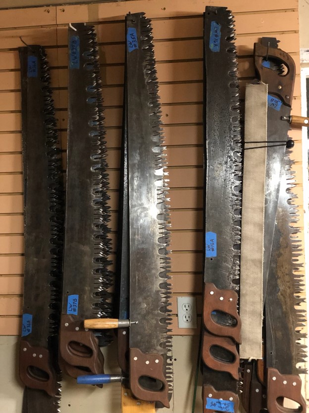 Photo “refurbished saws” Caption: Here are just some of the refurbished saws looking for a home with a sawyer who will use it to saw logs out of trails!