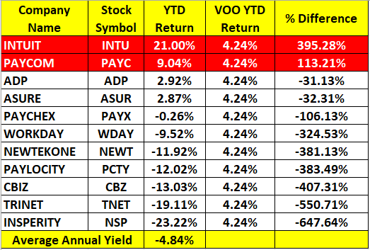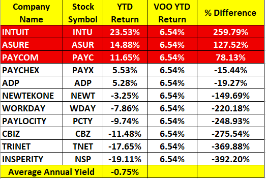 We've created a year-to-date ROI* chart for the payroll stocks below via YTDreturn.com. Any payroll stock that beats Vanguard's VOO ETF annual rate of return will be highlighted in red.