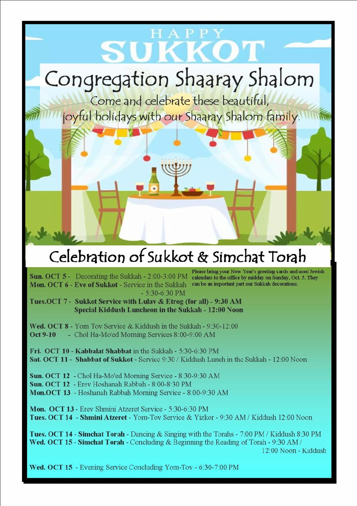 (Please bring your New Year's greeting cards and used Jewish calendars to the office by midday Sunday , Oct 5. They can be important part our Sukkah decorations.)
