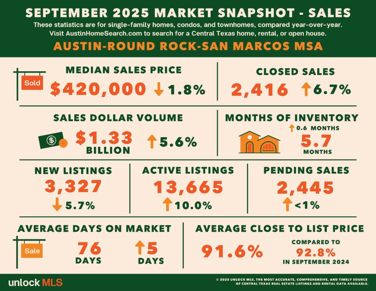 According to September sales data gathered from Unlock MLS, one of our MLS providers, closed sales rose 6.7% year over year to 2,416 sales in the Austin-Round Rock-San Marcos MSA, ending the third quarter with its strongest sales growth of 2025. Coupled with a 1.8% decrease in the median sales price to $420,000, the data reflects sustained activity through late summer and early fall, pointing to renewed buyer confidence and continued market balance as prices follow typical seasonality.