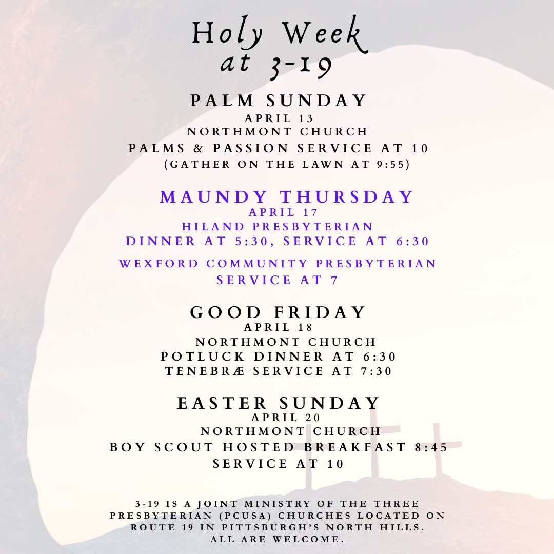 Northmont will be hosting a potluck before the 3-19 worship service. That service, which will begin at 7:30, will be Tenebrae — a service of shadows.