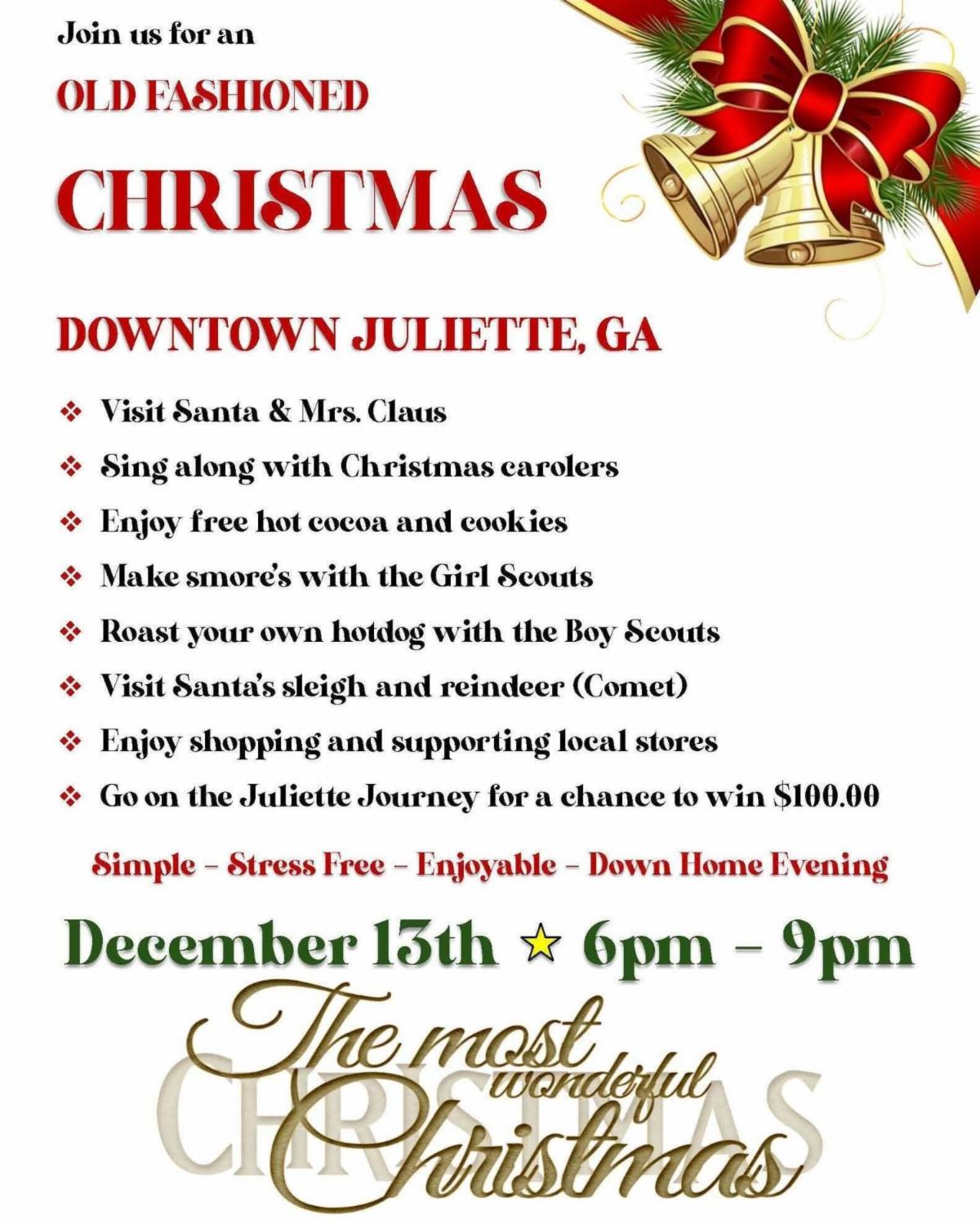 Join the shops in Juliette for an Old Fashioned Christmas celebration on Saturday, December 13th from 6PM – 9PM. Santa and Mrs. Claus will be visiting to take photos and there will be hot cocoa and cookies available. The Girl Scouts and Boy Scouts will be there as well, offering s’mores and roasted hot dogs! Bring the whole family for a cozy and old fashioned, small town Christmas!