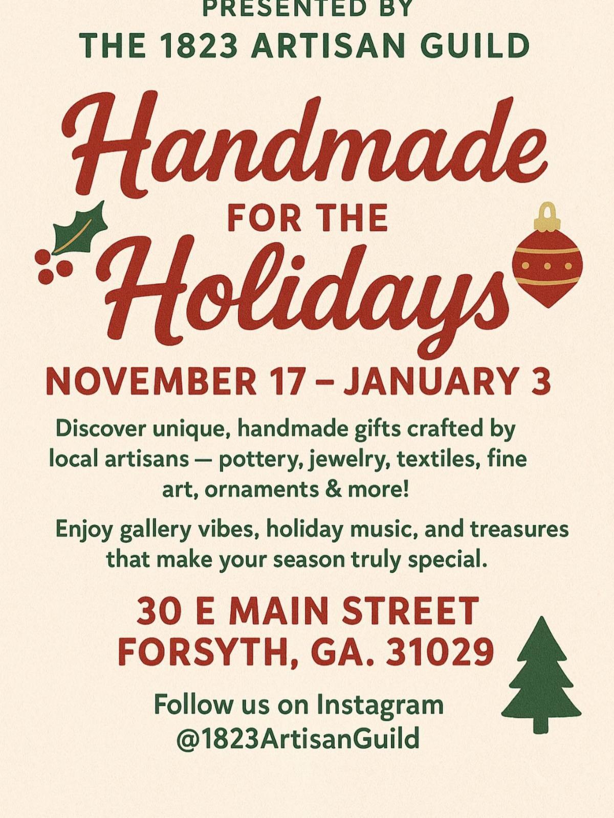 Find that perfect holiday gift at The 1823 Artisan Guild’s Handmade for the Holidays artisan bazaar exhibit! This event will run from November 17, 2025 – January 3, 2026. Discover unique, handmade gifts crafted by local artisans – pottery, jewelry, textiles, fine art, ornaments & more! Enjoy gallery vibes, holiday music, and treasures that make your season truly special.
