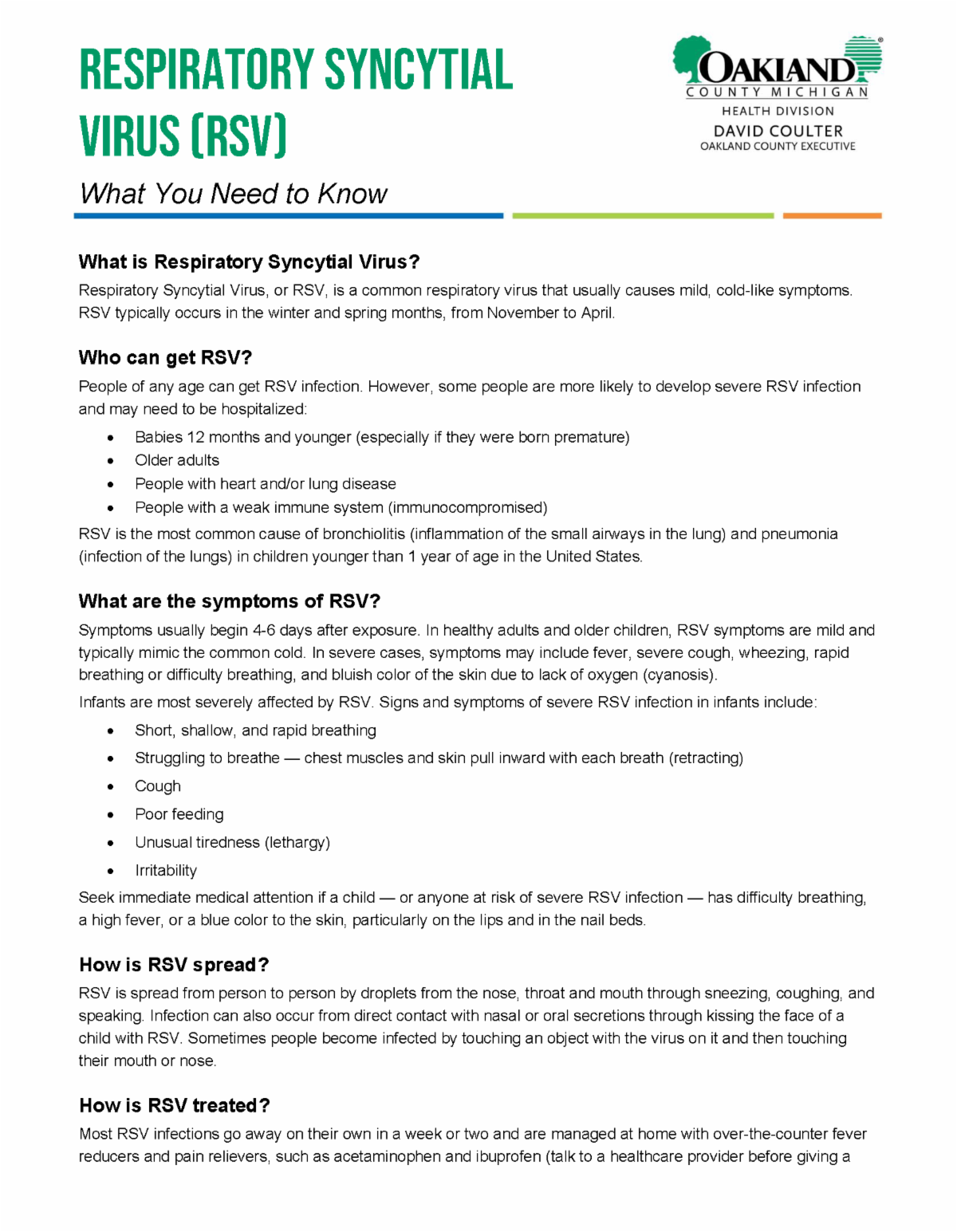 Pontiac, Michigan – A sharp increase in respiratory syncytial virus (RSV) cases within the last month is prompting Oakland County Health Division to urge residents to protect themselves against the illness. Children 4-years-old and younger are the largest group of patients visiting emergency rooms in Southeast Michigan for respiratory illnesses such as RSV and other viruses.