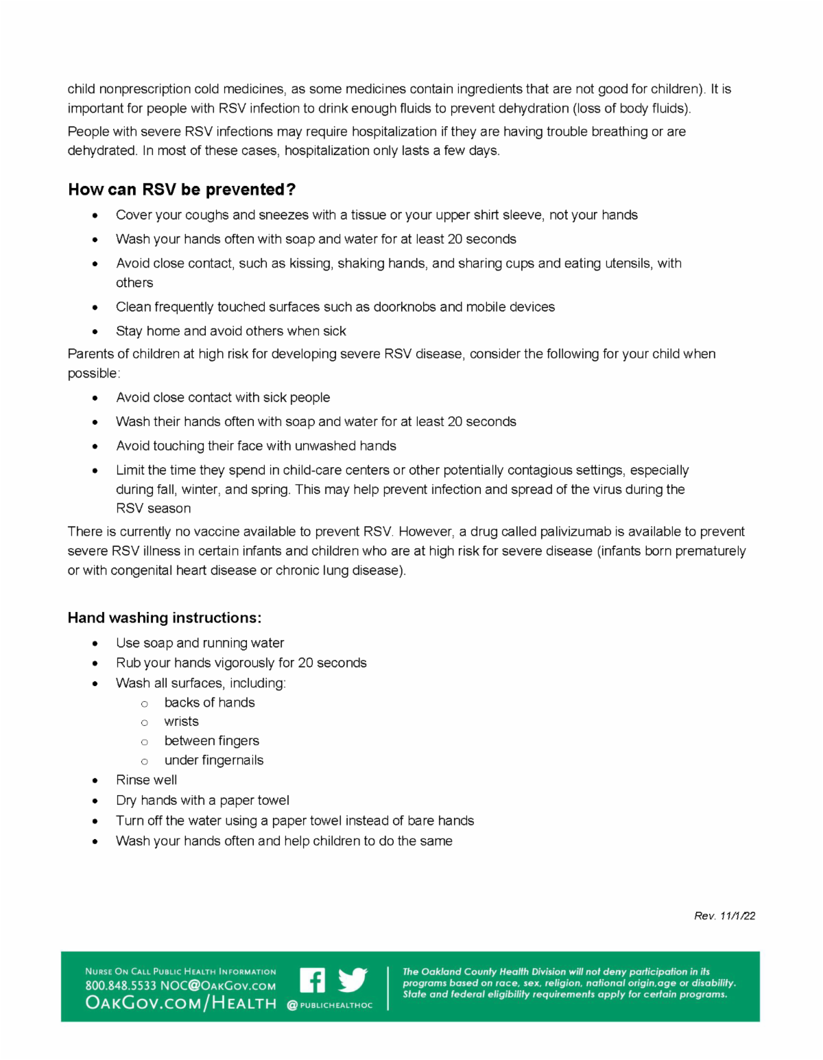 For more information about RSV, go to the Health Division's website at www.oakgov.com/health or by contacting Nurse on Call at 800-848-5533 or noc@oakgov.com. Nurse on Call is available 8 a.m. to 5 p.m., Monday through Friday. For up-to-date public health information, follow @publichealthOC on Facebook and Twitter.