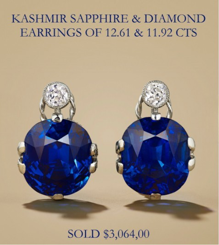 A pair of antique sapphire and diamond earrings, the second highest grossing lot in the sale, sold for slightly under $3.1 million, double their low estimate.