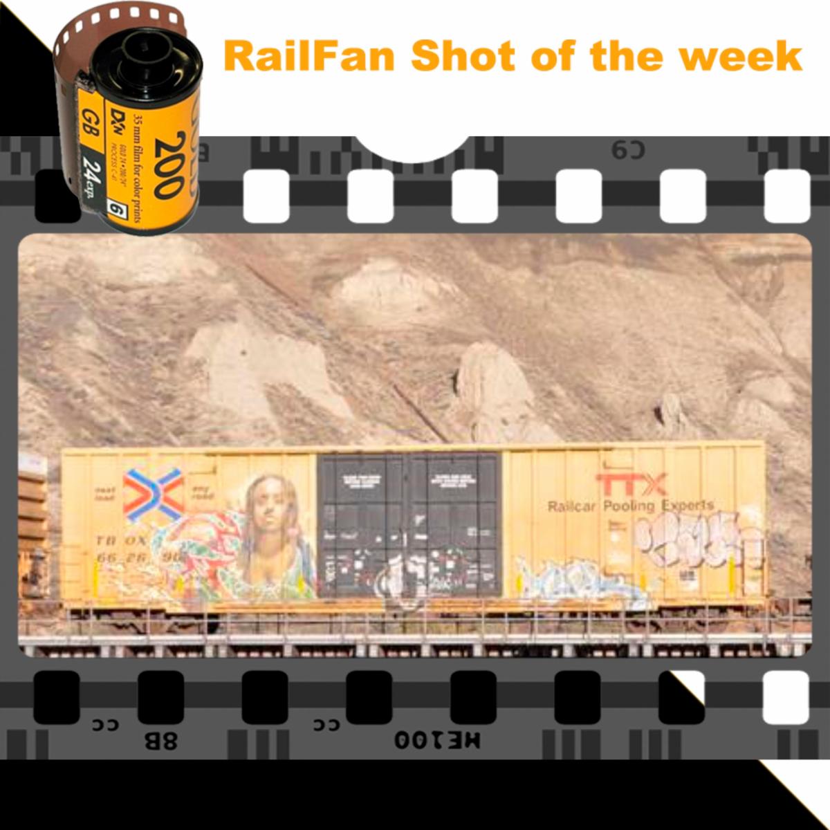 Railbox car with artistic graffiti heads east on CN train #416 at mp 47.2 Ashcroft subdivision on Nov. 7th, 2025.