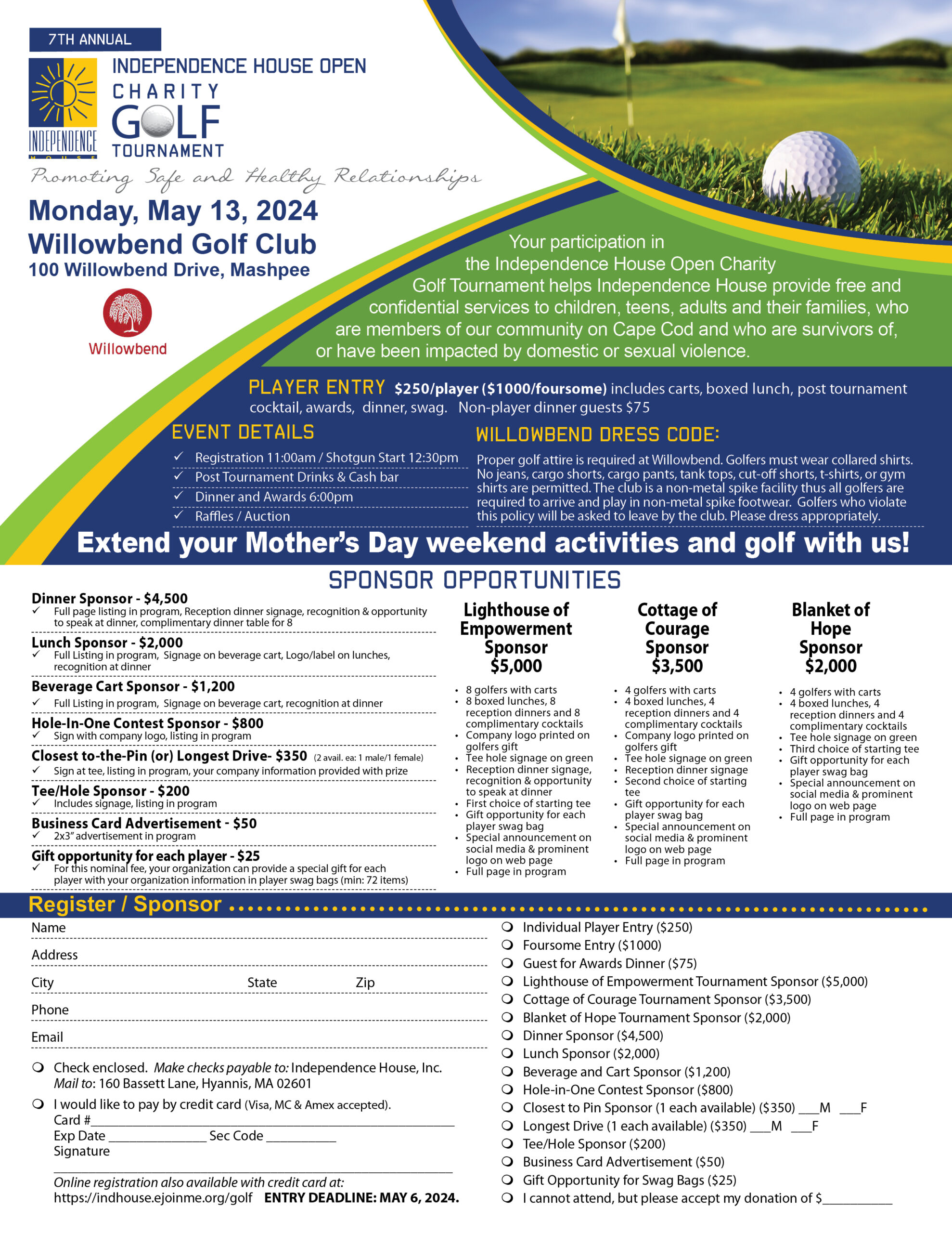 One event might seem small, but the impact we make in our community is huge with your participation. Proceeds from our golf tournament assist survivors of domestic and sexual violence in our community with free and confidential services and programs. Whether it's emergency shelter to keep individuals and their children safe, to legal or court advocacy, counseling, safety planning, or workshops that help empower and encourage a path to living independently and free from violence, Independence House is here- 24 hrs a day for anyone who needs us in the 15 towns on Cape Cod. Tournament proceed remain on Cape Cod to help Cape Codders. |