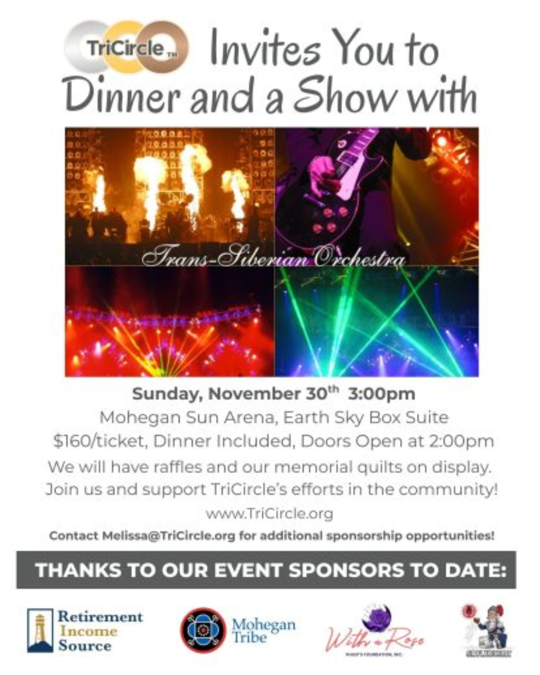 Trans-Siberian Orchestra Ghosts of Christmas Eve - Dinner and a Show, Mohegan Sun Earth Sky Box Suite, Sunday afternoon, November 30, doors open at 2:00 pm, show starts at 3:00 pm, $160 per person, amazing raffles and dinner included, proceeds benefit TriCircle. Limited seats available - see flyer below