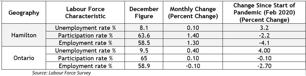 Across Ontario the labour market worsened in December, as lockdowns started to be implemented across more regions, including Hamilton. Employment decreased by 11,900 jobs in December, the first month of job losses after 6 months of gains. Most of the job losses came from part-time jobs. With the lockdown continuing in January, we most likely can expect job losses to continue. With the recent announcement of Ontario being placed into a state of emergency for 28 days it is inevitable that job losses will continue into February.